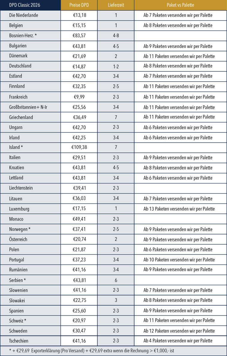 Täglich verschicken wir viele Pakete mit Stoffen an unsere Kunden in ganz Europa. Mit unserem Partner DPD stellen wir sicher, dass unsere Stoffe CO₂-neutral geliefert werden. Nachstehend finden Sie eine Übersicht über die Tarife. Die Lieferzeit von DPD wird ab dem Zeitpunkt der Anmeldung des Transports berechnet. DPD braucht dann in der Regel x Arbeitstage (die Lieferzeit), um Ihr Paket zuzustellen.