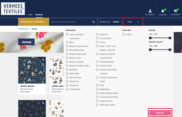 Gebruik tijdens het winkelen de handige filters. Onze webshop is voorzien van handige filters waarbij u kunt zoeken op verschillende niveaus. U kunt op kenmerk of thema zoeken, soort stof en breedte en gewicht. Klik daarna op de roze “ Pas toe” button en uw selectie wordt gekozen.