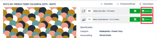 Alle kleuren bestellen van onze uni GOTS Jersey? Óf alle kleuren van dat ene geweldige dessin? Selecteer het artikel dat u wilt bestellen. Rechts naast de product foto vindt u nu een optie met direct bestellen (plankje of rol) daarnaast staat de button met direct bestellen in alle kleuren (beschikbaar in zowel plankje als rol). Dát scheelt een hoop tijd!