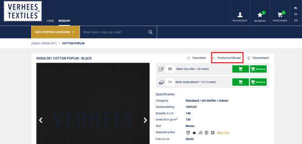 Verhees Textiles heeft voor vele stoffen een Oeko-Tex® en GOTS certificaat. Deze staan voor u beschikbaar onder “ Mijn account”, selecteer "overige downloads" en open de externe links van Oeko-Tex® en GOTS en download de certificaten. Ook voor Tencel staat het certificaat hier voor u klaar.